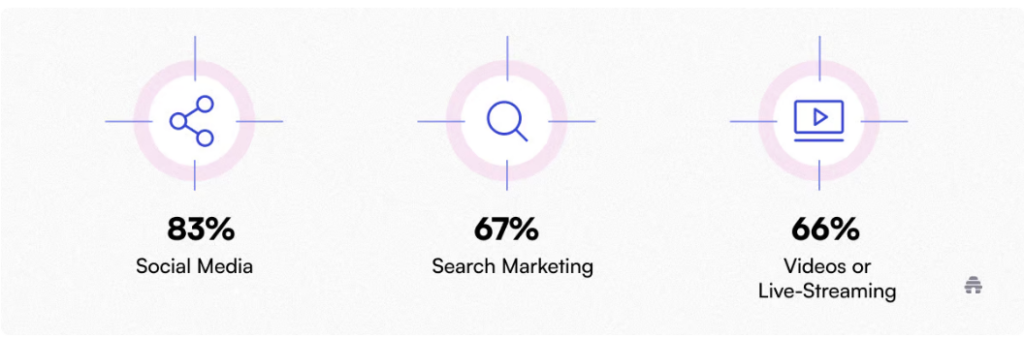 • As per a source, about 83% of marketers use social media, 67% use search marketing, and 66% use videos or live-streaming.